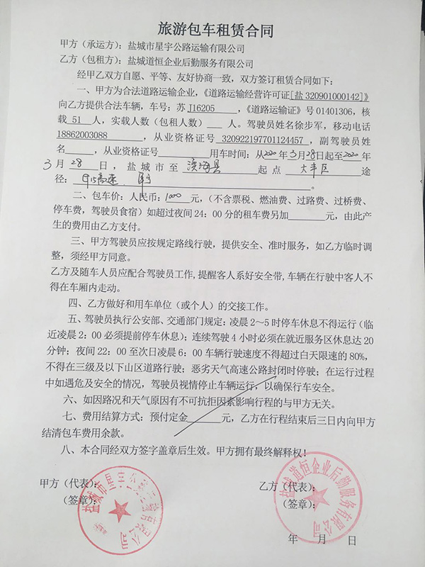 盐城市星宇公路运输有限公司旅游包车租赁合同